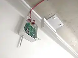 Wireless fire alarm transmitter being retroactively installed in a high-rise block to enable evacuation without a waking watch.