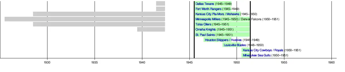 Milwaukee Sea GullsKansas City Royals (USHL)Louisville BladesHouston SkippersSt. Paul Saints (USHL)Omaha KnightsTulsa Oilers (1928–1951)Minneapolis Millers (AHA)Kansas City Pla-MorsFort Worth RangersDallas Texans (USHL)