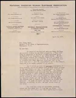 Suffragist Carrie Chapman Catt petitioned Speaker of the House Champ Clark on behalf of the National American Woman Suffrage Association on April 10, 1917, urging the House to create a Committee on Woman Suffrage.[4] She argued that the Judiciary Committee, which had jurisdiction over the issue, was too busy with other matters to address suffrage for women. During a May 18, 1917 hearing, numerous Representatives, including Jeannette Rankin, the only female member of the House, urged the House Rules Committee to create the Committee on Woman Suffrage.[5] The U.S. Senate had established the Select Committee on Woman Suffrage in 1882.[6]