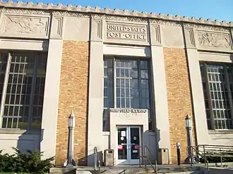 US Post Office-Hempstead is a historic post office building located at Hempstead, Nassau County, New York, United States. It was built in 1932 and designed by consulting architects Tooker & Marsh for the Office of the Supervising Architect. It is a two-story, symmetrically massed building faced with tan, brown, and red brick in the Classical Revival style. The central entrance features flanking octagonal aluminum Art Deco style lamps and other Art Deco ornamental detail.