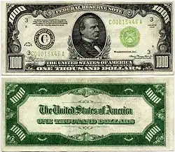 3. ^ "1,000 Dollars, Federal Reserve Note, United States, 1934". americanhistory.si.edu. Smithsonian. Retrieved 4 October 2024.
