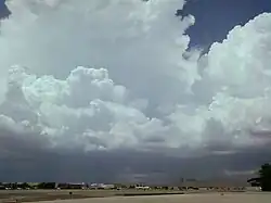 The convective season for the Plains ranges between May and September. Organized systems of thunderstorms known as mesoscale convective systems develop over the region during this period, with a bulk of the activity occurring between midnight and 6 a.m. local time. The time of maximum precipitation during the day gradually varies from late afternoon near the slopes of the Rockies to early morning near the Ohio River valley,[37] in part reflecting the west-to-east propagation of mesoscale convective systems. Mesoscale convective systems bring 30 to 70 percent of the annual warm season rainfall to the Plains.[38] An especially long-lived and well-organized type of mesoscale convective system called a mesoscale convective complex produces on average 8% to 18% of the annual warm season rainfall across the Plains and Midwest.[39] Squall lines account for 30% of the large thunderstorm complexes which move through the region.[40]