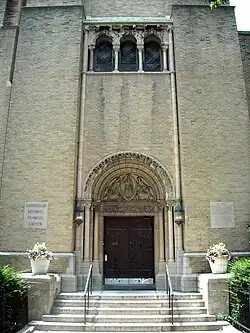 UNMC is an example of Romanesque Revival architecture and was designed by Allen & Collens, architects of the Riverside Church in New York City.[2][5] The four-story building, a contributing property to the Sixteenth Street Historic District, features a stained-glass window and a stone tower that reaches a height of 98 feet (30 m).[1][6]