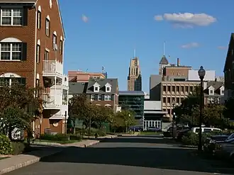 A view east along Academy Street from Society Hill towards downtown. In the center at the end of street the buildings visible in the mid-ground are part of Newark Tech (operates as part of the Essex County Vocational Technical Schools).