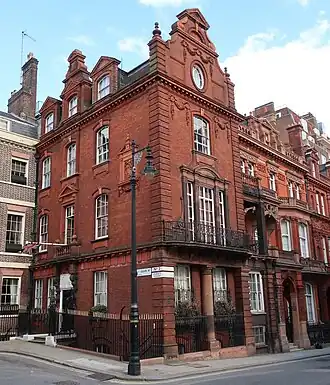 The house was built by Lord Arthur Russell in about 1880 to house his large family: the architect was T. H. Wyatt.[4][5] The terrace and garden are now planted with green, white and violet plants, the colours associated with the Suffragette movement. A large London plane tree stands in the middle of the garden, probably originally planted in the grounds of Chesterfield House.