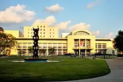 In the mission of finding UH a permanent home, heirs of philanthropists J. J. Settegast and Ben Taub donated 110 acres (0.45 km2) to the university for use as a permanent location in 1936.[32] At this time, there was no road that led to the land tract, but in 1937, the city added Saint Bernard Street, which was later renamed to Cullen Boulevard.[31] It would become a major thoroughfare of the campus. As a project of the National Youth Administration, workers were paid fifty cents an hour to clear the land. In 1938, Hugh Roy Cullen donated $335,000 (equivalent to $5.7 million in 2023) for the first building to be built at the location. The Roy Gustav Cullen Memorial Building was dedicated on June 4, 1939, and opened for classes officially on Wednesday, September 20, 1939.[30] The building was the first air-conditioned college building constructed on a U.S. campus.[28] A year after opening the new campus, the university had over 2,000 students.[28] As World War II approached, enrollment decreased due to the draft and enlistments. The university was one of six colleges selected to train radio technicians in the V-12 Navy College Training Program.[33][34] By the fall of 1943, there were only about 1,100 regular students at UH; thus, the 300 or so servicemen contributed in sustaining the faculty and facilities of the Engineering College. This training at UH continued until March 1945, with a total of 4,178 students.[35]