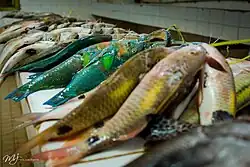 Parrotfish (Sparisoma viride) shown to be lined up at a market