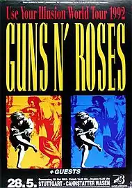 The Use Your Illusion Tour was a concert tour by American rock band Guns N' Roses which ran from January 20, 1991, to July 17, 1993. It was not only the band's longest tour, but one of the longest concert tours in rock history, consisting of 192 shows in 27 countries.[2] It was also a source of much infamy for the band, due to riots, late starts, cancellations and outspoken rantings by Axl Rose.