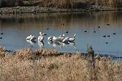 The Utah Lake wetland ecosystem is an important breeding area and stopover for migratory birds in the Pacific Flyway. Today, about 226 species of birds use the lake as their permanent home or as a stopover on their migration. The Utah Lake Wetland Preserve has been established at the south end of Utah Lake. It contains two units, one at Goshen bay with more than 21,750 acres (88.0 km2) of land preserved, and another unit at Benjamin Slough.[69] Birds seen at Utah Lake include sandhill crane, double-crested cormorant, great horned owl, turkey vulture, golden eagle, cinnamon teal duck, and mallard duck.[70]