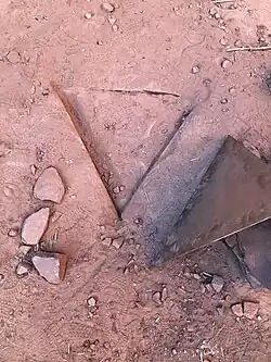 The Utah division of the Bureau of Land Management (BLM) said that it received credible reports that the monolith was removed on the evening of November 27, 2020, by a then-unknown party, now known to be the Moab-based recreationists Andy Lewis, Sylvan Christensen, Homer Manson, and an anonymous companion.[36][37] Several adventure photographers posted details and pictures about the dismantling and removal of the monolith.[2] One witness reported that the four men had pushed the monolith over without tools, while onlookers watched, saying "this is why you don't leave trash in the desert" before breaking it apart and carrying away the pieces in a wheelbarrow. The group referred to the conservation ethic of "Leave No Trace".[2][38] Photos of the site afterwards posted by visitors showed that all was left was a triangular metal piece (see photo), and witnesses reported seeing a pickup truck driving away from the site, carrying an object, as they approached.[39][40][41]