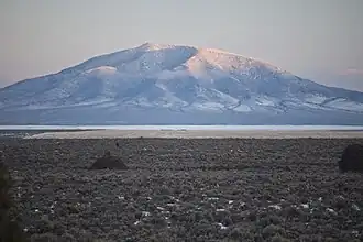 Ute Mountain is part of the Taos Mountains which are a subset of the Sangre de Cristo Mountains.[3] The isolated landmark is the highest point of the Cerro del Yuta Wilderness and Rio Grande del Norte National Monument which is administered by the Bureau of Land Management.[4] The remote mountain is situated 35 miles north of the town of Taos and four miles south of the New Mexico–Colorado border. Ute Mountain is a free-standing, dacitic, extinct Pliocene volcanic cone set within the Taos Plateau volcanic field.[8] Ute Mountain has a base diameter of five miles and topographic relief is significant as the summit rises 2,500 feet (760 meters) above the surrounding sagebrush-covered basalt plains.[2] The slopes of the mountain are covered with stands of pinyon pine, ponderosa pine, aspen and Douglas fir.[9] Precipitation runoff from the mountain drains to the Rio Grande which flows through a gorge along the western base of the mountain.