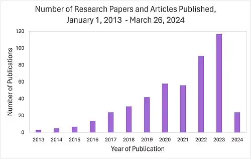 Bar chart demonstrating increased publications focusing on the uterine microbiome. A search keyword of “uterine microbiome” was used on Web of Science, and this bar chart only included articles and review papers. The date range of this search is from January 1, 2013 to March 26, 2024.