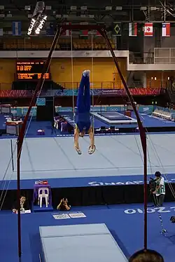 Eduard Shaulov performing on the rings during the artistic gymnastics competition on 16 August 2010 at Bishan Sports Hall, Singapore