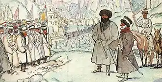 On 9 January 1918, Uzun-Hajji and Najmuddin marched on Temir-Khan-Shura along with between six and ten thousand supporters,[21] seeking to establish Najmuddin as imam. Najmuddin was appointed as imam by a local congregational mosque the next day, but three days after that, the Dagestan Congress annulled the appointment. After Najmuddin returned to his former status as Mufti of the North Caucasus, Uzun-Hajji gathered his forces and abandoned the mufti for the mountains, dissatisfied with his unwillingness to enforce his desire to become imam.[22] After Uzun-Hajji left for the mountains, his troops began engaging in violence against ethnic Russians, such as Russian settlers and the Terek Cossacks.[23]