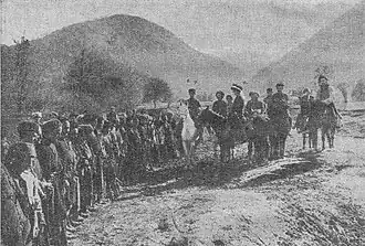 Uzun-Hajji's successes found him increasingly popular.[49] The states of the South Caucasus – the First Republic of Armenia, the Azerbaijan Democratic Republic, and the Democratic Republic of Georgia – all sought to avoid a shared border with Russia, and viewed Uzun-Hajji as able to ensure such a result.[42] Georgia in particular began providing military and materiel assistance to the emirate,[50] and the two countries signed an agreement for Georgia to recognise the emirate and provide arms shipments. In return, Uzun-Hajji ordered his soldiers to block the Georgian Military Road, blocking the would-be primary route for White Russian forces into Georgia.[51] A group of fifty officers from Georgia, under the command of Leo Kereselidze, arrived in the country,[48] as did military instructors from the former Austro-Hungarian and German empires.[52]