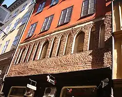 During a restoration in 1946, a medieval bricked wall was discovered on Number 29, today exposed over the shop windows. The eleven pointed arches and the bricked herringbone pattern, dates back to the 14th century, while the glazed window are later additions — the first glazier in Stockholm is mentioned in 1421 and glass was still luxury at the time, so these windows were shut using wooden shutters, some rays of light possibly passing in through scraped leather or panes of bones. The cast iron columns on street-level are from the 19th century.[12]