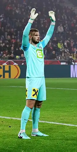 Jaroš went on to keep five clean sheets in six games as his side remained unbeaten after nine games, conceding just four goals.[16] On 12 November 2021, Jaroš was named as the club's Player of the Year, as voted by the club's supporters following a debut season that saw him help his side to a 2nd place finish, their best since the club's 2013 title win.[17][18] On 28 November 2021, Jaroš made his last appearance for the club in the 2021 FAI Cup Final, beating rivals Bohemians 4–3 on penalties following a 1–1 draw after extra time in front of a record FAI Cup Final crowd of 37,126 at the Aviva Stadium.[19][20][21][22] He departed the club at the end of the season, waiting for guidance from Jürgen Klopp on where his next move would be, with the Liverpool manager stating "Vit was brilliant in Ireland", while Pat's manager Stephen O'Donnell stated he was the best 20-year-old goalkeeper he had ever seen, including Kasper Schmeichel who was a teammate of his at Falkirk at the same age.[23][24][25] On 26 January 2022, it was announced that Jaroš had been named SWI Goalkeeper of the Year as voted by Irish journalists.[26][27][28]