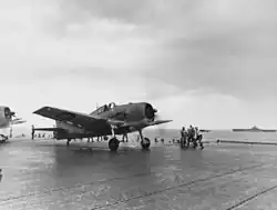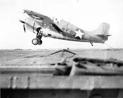 In late August 1942, VF-9 was deployed aboard USS Ranger to support Operation Torch.[2]: 10 By late November 1942, Ranger had returned to NAS Norfolk and VF-9 rejoined the rest of CVG-9.[3] VF-9 became the first Navy squadron to receive the F6F-3 Hellcat in February 1943.[2]: 7
