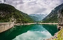 Water in the Antrona Valley is a significant resource; streams and lakes abound. The Ovesca river, from its headwaters at Lake Antrona, runs the entire course of the valley. Lake Antrona was formed naturally following a landslide in 1642; its main tributary is the Troncone from the Pizzo d'Antigine. Shortly before flowing into Lake Antrona, the waters of the Troncone are dammed, creating the artificial Lake Campliccioli and used for hydroelectric power. Another artificial lake is Lake Cingino, located at 2,262 m above sea level. It is famous for its Alpine Ibex, who ascend the nearly vertical wall of the dam to lick salts (saltpeter).[2]