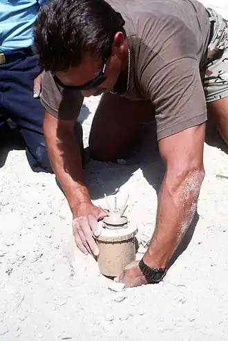 A Valmara 69 mine during training by Explosive Ordnance Disposal (EOD) Team in Kuwait, 1992.