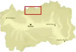The Valpelline branches from the Great St Bernard Valley near Gignod and rises to the Collon Pass, which it shares with Valais, and which is located at the foot of the Grand Combin, whose peak is across the border in Switzerland.