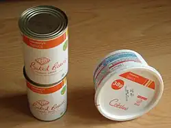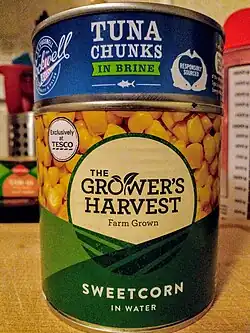 Tesco's value brand was originally launched in 1993 as Tesco Value, with distinctive blue-and-white striped packaging.[2] In April 2012 the range was rebranded as Everyday Value, with new packaging and a revised product range which omitted artificial colours and flavours. The original Tesco Value brand had been launched in the midst of a supermarket price war,[3] and targeted a low price point, with cans of beans costing 3p a can[2] and loaves of bread for 7p.[2]