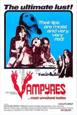 1. ^ The majority of bibliographic sources classify Vampyres as a 1974 feature (the year in which it was filmed).[3][4][5] However, some sources categorize it as a 1975 or 1976 film: The British Film Institute classes it as a 1976 feature, as this was the year of its release there.[6]
