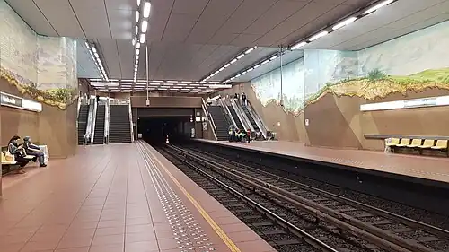 The murals in the metro station are by the Belgian artist Paul De Gobert.