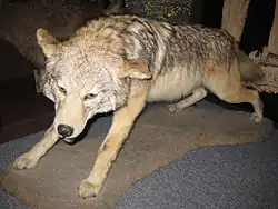The coyote measured nearly 4.5 feet (1.4 m) long and weighed 35 pounds (16 kg), and its fangs were an inch long.[2] It was initially strung up in the local schoolyard,[2] and more than 3,000 people came to see the dead animal.[2][3] Later, it was hung from a tree near the Tazewell County Court House, attracting a further 7,500 visitors.[2] The animal was stuffed and is currently on display at the Crab Orchard Museum in Tazewell, Virginia.[4][5]