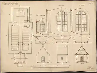 The old medieval church was likely built in the late 12th century. The church originally consisted of a rectangular stone nave which had a choir in the same room, rather than a separate room like many other churches. Later, the building was enlarged. During the 17th century, a small church porch was built on the west end of the nave, to serve as a new main entrance to the building. In 1673, the church ownership was transferred from the King to the Count of Jarlsberg. In 1767, the Count sold the church to the local people of the parish for 175 rigsdaler. In 1846, a smaller, rectangular stone chancel was added onto the east end of the nave. At the same time, new second floor seating galleries were added along the west and north walls. In 1903, the church porch was torn down and a new stone church porch was built to replace it. In 1905, the second floor seating gallery on the north wall was removed. In 1983, the church porch was torn down and again replaced with a new wooden church porch.[3][4]