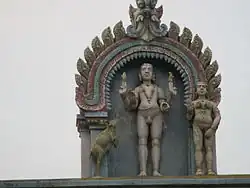 As per Hindu legend, Shiva appeared in the form of Andakasura samhara murthy to slay the demon king Andakasura.[1] Andakasura was a demon who attained powers close to immortality on account of his severe penance to Brahma, the Hindu god of creation. The boon attained had just one condition that when he lusts his mother, he would be killed. He made undue use of his powers and was troubling humans and celestial deities. During one such encounters, he started lusting toward Parvathi, the wife of Shiva and who was like his mother. Shiva appeared as Andakasura samhara murthy and slayed Andaka with his trident. Realising his mistake, he pleaded Shiva to make him a devotee of his in the next birth. It is believed that Shiva readily agreed and Andaka was born as Gana Bhringi.[2]