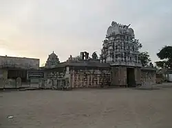 Veerateeswarar temple is located in Thirukoilur, a town panchayat located on the banks of Then Pennai river, located 40 km (25 mi) from Villupuram. The temple has two parallel structures, each of which has a three-tiered Rajagopuram, the gateway tower. The temple has large granite rectangular walls that houses all the shrines. The sanctum sanctorum houses the image of Veerateeswarar in the form of Lingam, an iconic form of Shiva. There is an Ardha Mandapa and a Mukha mandapa, pillared halls leading to the sanctum. The first precinct has the shrines of Vinayakar, Murugan, Durga, Dakshinamurthy and Chandikeswara. The first precinct also houses metal image of Nataraja, Somaskanda and Andhakasura. The second structure houses the image of Periyanayagi. Like the Shiva temple, here also the sanctum is approached through an Ardha Mandapa and Mukha mandapa. There is a precinct around the sanctum.[3][5]