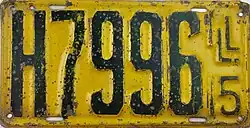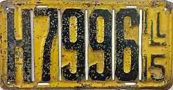 1915 Dark blue on yellow; "ILL 15" at right none 12345 1 to 99999 Letters H, K, P, R, T, U, X and Y used in the A1234 serial format.[26]