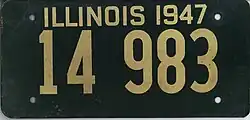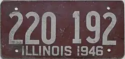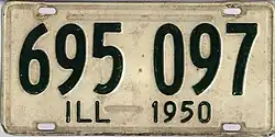 32. ^ "Auto License Plates Go On Sale Tomorrow". Chicago Tribune. August 25, 1949. p. 23. The 1950 Illinois license plates will have ivy green numerals on an off-white base . . . . Passenger car plates will be made of rust resistant aluminum, said [State Secretary] Barrett.