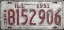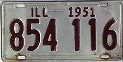 33. ^ "Illinois License Plates For 1951, Maroon on Silver". The Daily Register. Harrisburg, IL. September 29, 1950. p. 6. Secretary of State Edward J. Barrett announced today that 1951 Illinois license plates will feature maroon numbers on an unpainted aluminum background, which is silverish in color.
