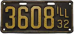 1932 Golden yellow on dark blue with border line; "ILL 32" at right none 1-234-567 1 to approximately 1-301-000
