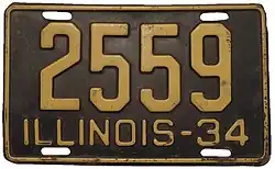 1934 Yellow on black with border line; "ILL-34", "ILLINOIS-34" or "ILLINOIS-1934" at bottom (see right) none 1-234-567 1 to approximately 1-285-000 Plates with serials 1 through 999 had "ILL-34" at the bottom; plates with serials 1000 through 9999 had "ILLINOIS-34"; and plates with serials 10-000 and up had "ILLINOIS-1934". The latter two groups were the first plates to feature the full state name.