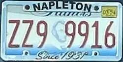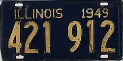 31. ^ "Mail Out First Auto License Plates". Christopher Progress. Christopher, IL. December 16, 1948. p. 1. The plates were made of steel this year instead of the substitute materials used during the war years. They have a dark blue background and canary yellow numerals.