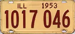 35. ^ "Illinois Auto Plates In '53 To Be Red On Buff". Chicago Tribune. May 26, 1952. p. 2. Illinois' 1953 auto license plates will be ruby red figures on a buff background, Secretary of State Edward J. Barrett announced yesterday.