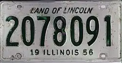 38. ^ "1956 Auto Tag Color Scheme: Gray and Green". Chicago Tribune. August 10, 1955. p. 12. Illinois' 1956 automobile license plates will be powder gray with ivy green numerals.