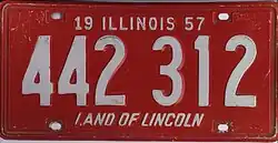 In 1956, the United States, Canada, and Mexico came to an agreement with the American Association of Motor Vehicle Administrators, the Automobile Manufacturers Association and the National Safety Council that standardized the size for license plates for vehicles (except those for motorcycles) at 6 inches (15 cm) in height by 12 inches (30 cm) in width, with standardized mounting holes.[2] The 1956 (dated 1957) issue was the first Illinois license plate that fully complied with these standards: the 1955 (dated 1956) issue was 6 inches in height by 12 inches in width, but had non-standard mounting holes.