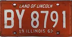 44. ^ "White, Orange To Be License Colors In 1962". Chicago Tribune. July 25, 1961. p. B5. The secretary of state's office said the color combination was chosen from a list of 22 recommended by the University of Illinois engineers who prompted the change this year to the numeral-letter system. . . . The colors are not those of a college or university as has been the custom of recent years. No college or university requested its colors be used in 1962.