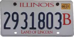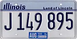 The new multiyear baseplate, which began to be issued in July 2001, was the first fully graphic passenger plate issued by the state of Illinois. The design, dark red characters on a background that faded from white at the top to dark blue at the bottom, was chosen by Internet voters from among nine different designs. The word "Illinois" was centered in a script font at the top, the "Land of Lincoln" slogan was once more centered at the bottom of the plate, and a single sticker well, half the size of the former well, was at the top right corner. In the center of the plate was a silhouette of Abraham Lincoln. Approximately 8.5 million passenger plates were scheduled to be replaced in a single year although replacement plates for all vehicle types was scheduled to take place over three years.[19][20] Approximately 6.5 million passenger plates were made in Illinois at Macon County Rehabilitation Facilities, Inc. in Decatur, and another 2 million plates were made by Waldale Manufacturing Ltd. of Amherst, Nova Scotia, Canada in order to produce all of the passenger plates needed in a single year.[21]