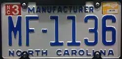 Manufacturer | Embossed blue on white with border line; "NORTH CAROLINA" at bottom; "MANUFACTURER" at top | MF-1234 | MF-1001 to present | ||