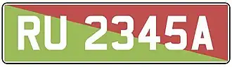 A "Restricted Use" vehicle displays a registration plate with white letters on a diagonally bisected background, the upper half of which is red and the lower half emerald green. The two lead characters of the plate are "RU".