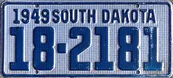 1949 | Embossed blue on waffle-textured unpainted aluminum with border line; "1949 SOUTH DAKOTA" at top | none | 1-1234 10-1234 |