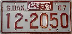 1967 | Embossed maroon on reflective white with border line; "S.DAK.", stamped Mount Rushmore graphic and "67" at top | none | 1-12345 10-1234 |