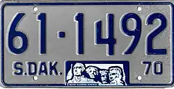 1970 | Embossed dark blue on reflective white with border line; "S.DAK.", stamped Mount Rushmore graphic and "70" at bottom | none | 1-12345 10-1234 |