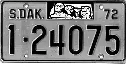 1972 | Embossed black on reflective white with border line; "S.DAK.", stamped Mount Rushmore graphic and "72" at top | none | 1-12345 10-1234 |