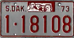 1973 | Embossed red on reflective white with border line; "S.DAK.", stamped Mount Rushmore graphic and "73" at top | none | 1-12345 10-1234 |